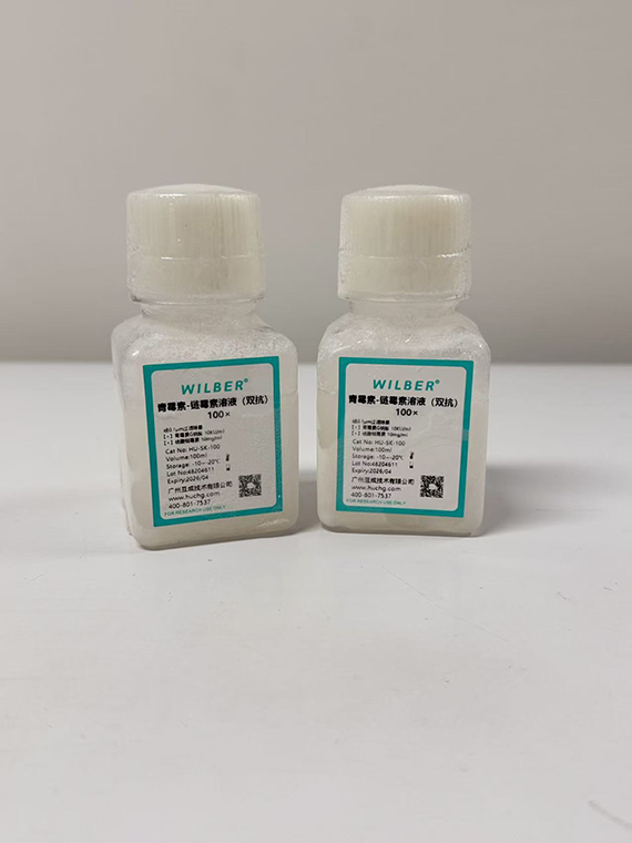青霉素-链霉素(Penicillin-Streptomycin Solution)混合液,通常也被称为“双抗”,是体外培养中为预防微生物污染最常用的抗生素,常配制成100倍浓度母液使用。其中,青霉素能够干扰细菌细胞壁的合成,对革兰阳性菌特别有效;而链霉素能够与细菌核糖体30S亚单位结合,抑制细菌蛋白质的合成,对革兰氏阴性菌和革兰氏阳性菌均有效,但对革兰氏阴性菌特别有效。青霉素和链霉素联合使用可以预防绝大部分的细菌污染,但青霉素溶液对温度和酸碱度较为敏感,室温易降解,需冷冻保存,PH 6.0~6.5时最为稳定;而链霉素则相对稳定,PH 5.0~7.5时最为稳定。