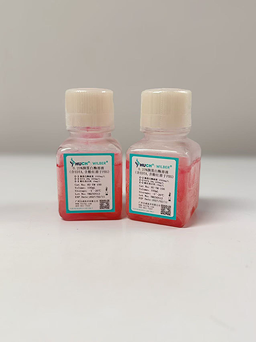 胰蛋白酶(Trypsin)是一种丝氨酸水解酶,它能把多肽链中赖氨酸和精氨酸残基中的羧基侧切段,水解细胞间的蛋白质,破坏细胞间的连接,从而使组织或贴壁细胞离散成单个细胞。胰酶分散细胞的活性与组织或细胞的特性、胰酶浓度、温度和作用时间有关,在PH 8.0和37℃时,胰酶的作用能力最强,因此使用胰酶时,应把握好浓度、温度和时间,以免消化过度造成细胞损伤。